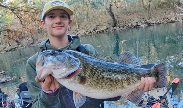 Looks like a painted taxidermy bass, don’t it? 5.95 lbs , 22.4″ long, caught by 14-year-old Sheldon Grace from Headland, AL on the Chipola River — nice feesh dude! Was fishing from some kinda boat that rhymes “pie rack” or “sky yak” or something…lol. Said he fought it for 30 minutes??