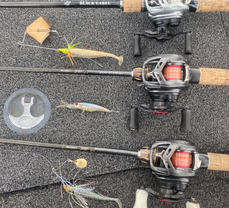 > 5" Berkley MaxScent Flatnose Jerk Shad or Deps Sakamata Shad, 1/8- or 3/16-oz custom tungsten jighead, 6-lb Berkley X5 Braid (flame green) to 12-lb Berkley Trilene 100% Fluoro, Abu Garcia Zenon MGX Spin Reel (3000), 6' 10" ML Abu Garcia Zenon Spin Rod.