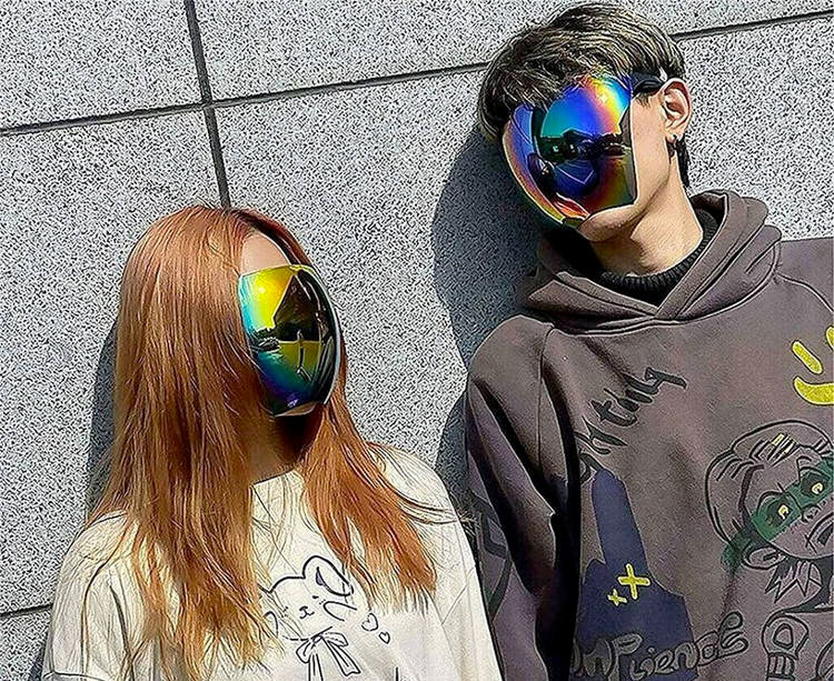 > ...it covers the whole face, like a face shield, but then it features one giant polarized lens and features a frame that slides behind the ears, like traditional eyeglasses. Plus, it’s obviously designed as more of a fashion accessory than for practical use.