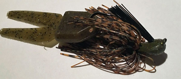 > “It’s a really good jig out of the package. It’s an Arkie-style head with kind of a keel-shaped bottom so you can skip it under docks. The line tie is semi-recessed to it comes through cover better.