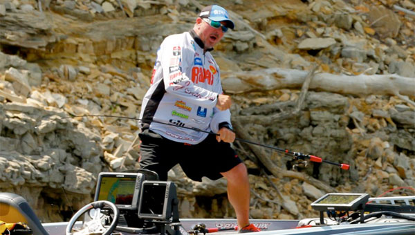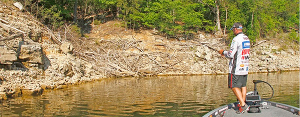 > “The third [practice] day I was on Bull Shoals again and I didn’t have a bite. So I ran to a place 4 miles up the river, near Diamond City. I pulled up on a channel-swing bank, made three pitches and got a bite. So I cranked my engine up and found three creeks like that one, that had stained water and channel-swing banks in the back. I didn’t fish them, just rode around to look at water color.