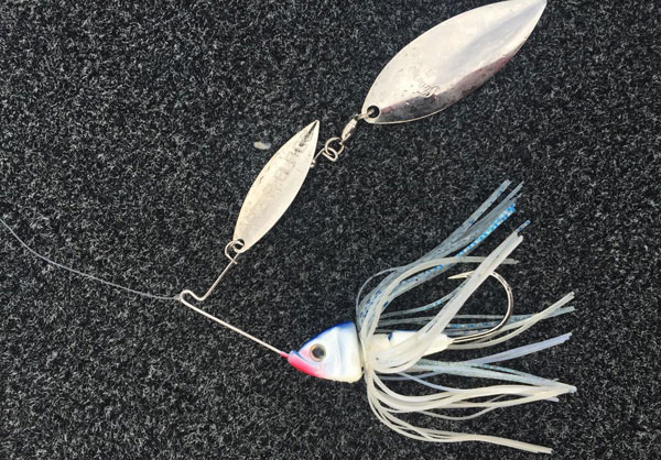 > “For the shad spawn, I fished the Strike King KVD Sexy Dawg and the large-size KVD Splash, both in blue gizzard shad. I also threw a 1/2-oz KVD spinnerbait in blue glimmer shad.” [It was a Bass Pro-exclusive KVD Scorcher spinnerbait, similar to the Burner but the head is a little different.]
